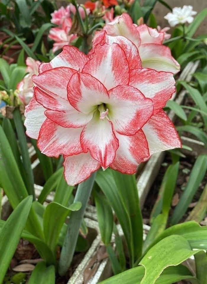 The ‘Flaming Peacock‘ amaryllis (Hippeastrum) is a stunning, easy-to-grow bulb producing large, fully double flowers with velvety red and white striped petals. Ideal for holiday, indoor forcing (40–60 days to bloom), it grows 18–24 inches tall and often produces 2-3 stems with 5-6 blooms each, making a festive centerpiece.