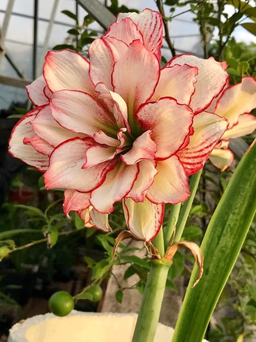 The Amaryllis ‘Joker Plus’ is a hybrid bulb variety (part of the Hippeastrum genus) known for its vibrant, dual-colored blooms featuring striking red streaks on a white background. It is typically grown indoors as a houseplant, especially during winter months, and is prized for its dramatic aesthetic.